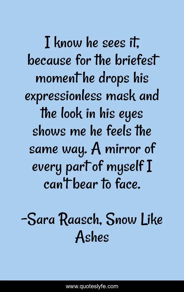 This page presents the quote "I know he sees it, because for the briefest moment he drops his expressionless mask and the look in his eyes shows me he feels the same way. A mirror of every part of myself I can't bear to face.". Author of this quote is Sara Raasch, Snow Like Ashes. This quote is about ya, fantasy,.
