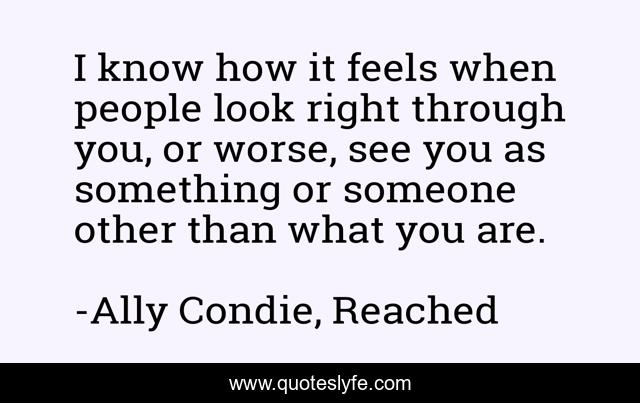 This page presents the quote "I know how it feels when people look right through you, or worse, see you as something or someone other than what you are.". Author of this quote is Ally Condie, Reached. This quote is about look-right-through-me, disappointment,.