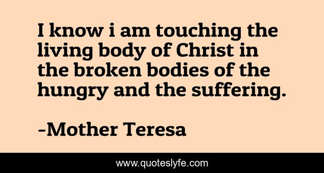 This page presents the quote "I know i am touching the living body of Christ in the broken bodies of the hungry and the suffering.". Author of this quote is Mother Teresa. This quote is about body-of-christ, love, suffering, affection, hungry,.