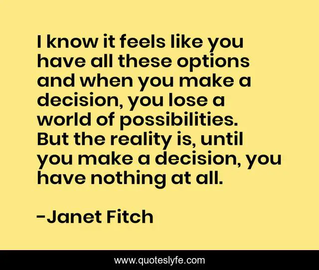 This page presents the quote "I know it feels like you have all these options and when you make a decision, you lose a world of possibilities. But the reality is, until you make a decision, you have nothing at all.". Author of this quote is Janet Fitch. This quote is about life, possibility, choices,.