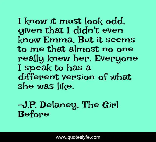 This page presents the quote "I know it must look odd, given that I didn't even know Emma. But it seems to me that almost no one really knew her. Everyone I speak to has a different version of what she was like.". Author of this quote is J.P. Delaney, The Girl Before. This quote is about the-girl-before, emma-matthews, different-perspectives, conflicting-accounts, j-p-delaney, personality,.