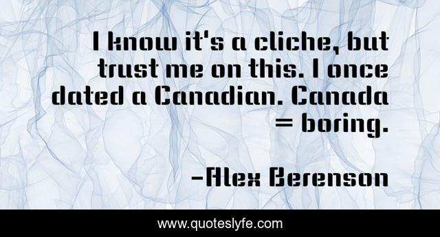 This page presents the quote "I know it's a cliche, but trust me on this. I once dated a Canadian. Canada = boring.". Author of this quote is Alex Berenson. This quote is about me, canada,.