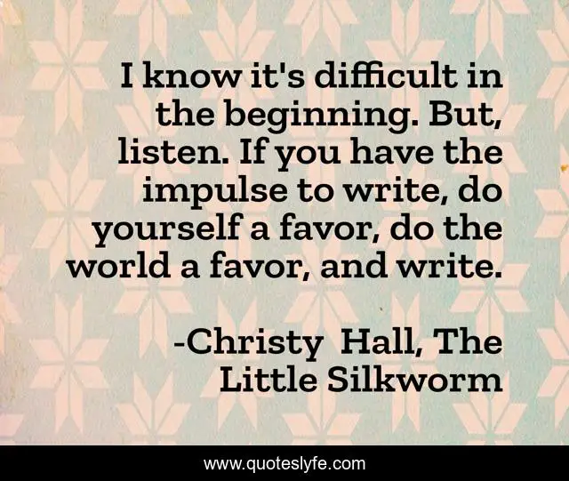 This page presents the quote "I know it's difficult in the beginning. But, listen. If you have the impulse to write, do yourself a favor, do the world a favor, and write.". Author of this quote is Christy Hall, The Little Silkworm. This quote is about writing-craft, writing-advice, writing-process, writers-life, writing, write, writers, inspirational, enthusiasm,.