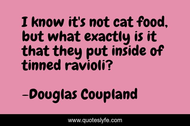 This page presents the quote "I know it's not cat food, but what exactly is it that they put inside of tinned ravioli?". Author of this quote is Douglas Coupland. This quote is about inside, cat,.