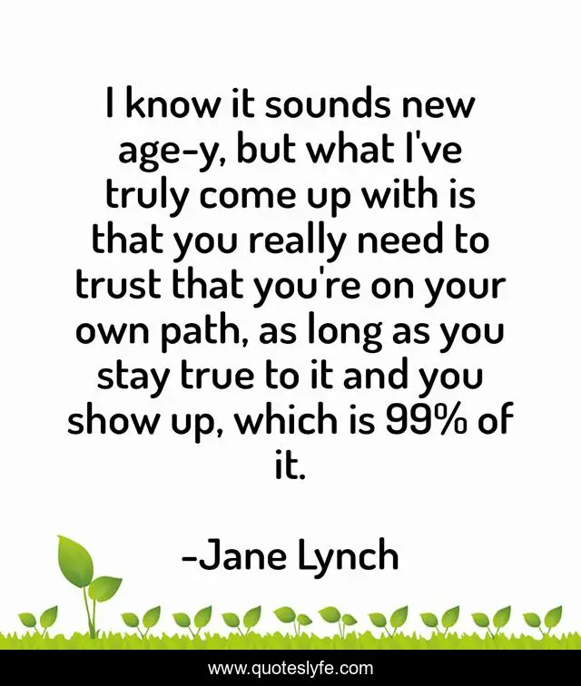 This page presents the quote "I know it sounds new age-y, but what I've truly come up with is that you really need to trust that you're on your own path, as long as you stay true to it and you show up, which is 99% of it.". Author of this quote is Jane Lynch. This quote is about path, long,.