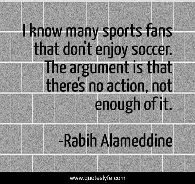 This page presents the quote "I know many sports fans that don't enjoy soccer. The argument is that there's no action, not enough of it.". Author of this quote is Rabih Alameddine. This quote is about action, enjoy, soccer,.