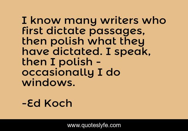 This page presents the quote "I know many writers who first dictate passages, then polish what they have dictated. I speak, then I polish - occasionally I do windows.". Author of this quote is Ed Koch. This quote is about windows, speak,.