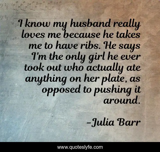 This page presents the quote "I know my husband really loves me because he takes me to have ribs. He says I'm the only girl he ever took out who actually ate anything on her plate, as opposed to pushing it around.". Author of this quote is Julia Barr. This quote is about me, girl, husband,.