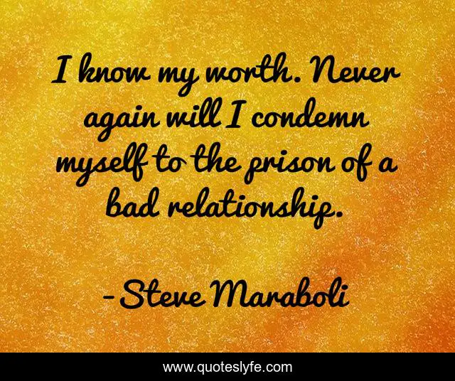 This page presents the quote "I know my worth. Never again will I condemn myself to the prison of a bad relationship.". Author of this quote is Steve Maraboli. This quote is about life-lesson, relationship, love, worth, affection,.