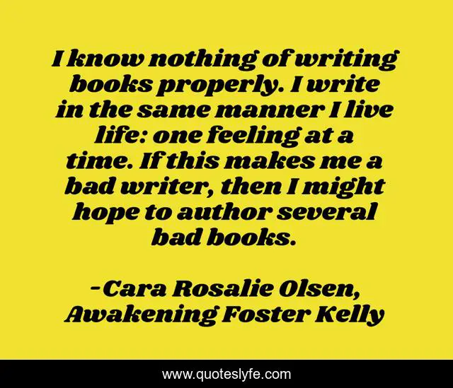 This page presents the quote "I know nothing of writing books properly. I write in the same manner I live life: one feeling at a time. If this makes me a bad writer, then I might hope to author several bad books.". Author of this quote is Cara Rosalie Olsen, Awakening Foster Kelly. This quote is about feelings, inspiration, emotions, encouragement, writing,.