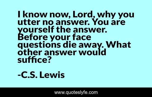 This page presents the quote "I know now, Lord, why you utter no answer. You are yourself the answer. Before your face questions die away. What other answer would suffice?". Author of this quote is C.S. Lewis. This quote is about faith, unfathomable,.
