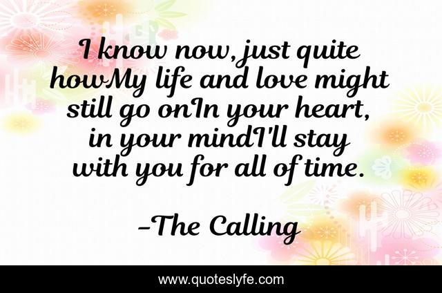 This page presents the quote "I know now, just quite howMy life and love might still go onIn your heart, in your mindI'll stay with you for all of time.". Author of this quote is The Calling. This quote is about loss, hope, unconditional-love,.