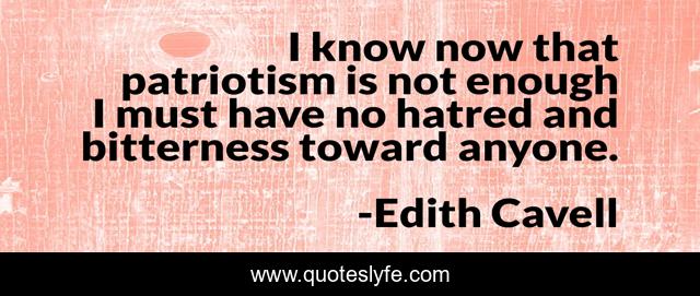 This page presents the quote "I know now that patriotism is not enough I must have no hatred and bitterness toward anyone.". Author of this quote is Edith Cavell. .