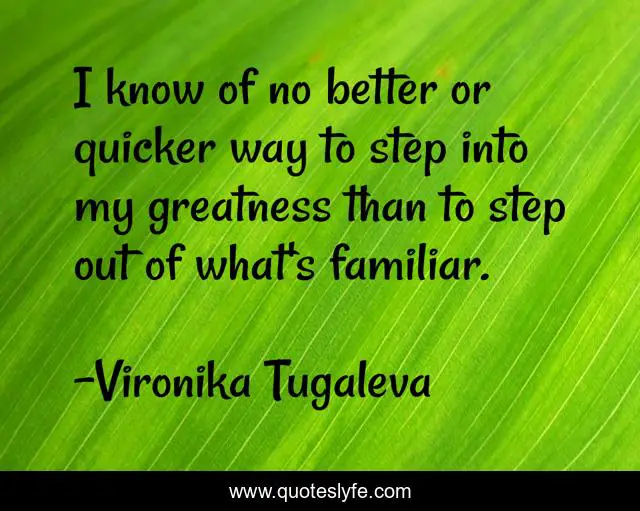 This page presents the quote "I know of no better or quicker way to step into my greatness than to step out of what's familiar.". Author of this quote is Vironika Tugaleva. This quote is about facing-fears, comfort-zone, courage, greatness, fear, bravery,.