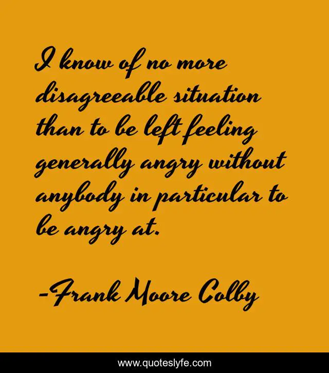 This page presents the quote "I know of no more disagreeable situation than to be left feeling generally angry without anybody in particular to be angry at.". Author of this quote is Frank Moore Colby. This quote is about situation, angry,.