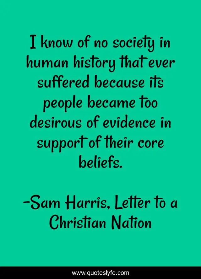 This page presents the quote "I know of no society in human history that ever suffered because its people became too desirous of evidence in support of their core beliefs.". Author of this quote is Sam Harris, Letter to a Christian Nation. This quote is about faith, skepticism,.