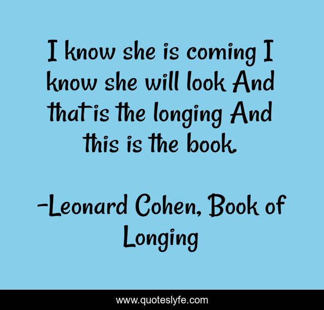 This page presents the quote "I know she is coming I know she will look And that is the longing And this is the book.". Author of this quote is Leonard Cohen, Book of Longing. .