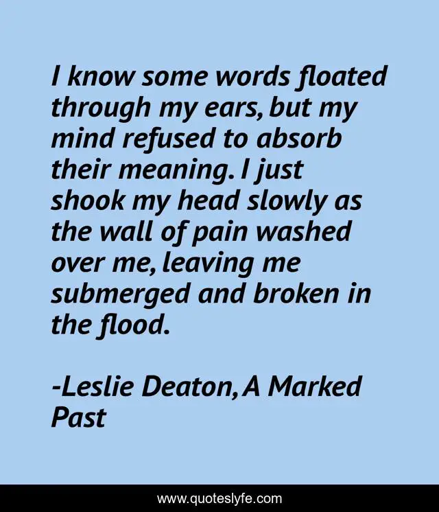 This page presents the quote "I know some words floated through my ears, but my mind refused to absorb their meaning. I just shook my head slowly as the wall of pain washed over me, leaving me submerged and broken in the flood.". Author of this quote is Leslie Deaton, A Marked Past. This quote is about young-adult-fiction, witches,.