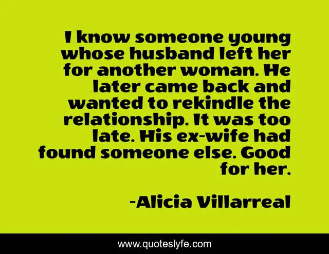 This page presents the quote "I know someone young whose husband left her for another woman. He later came back and wanted to rekindle the relationship. It was too late. His ex-wife had found someone else. Good for her.". Author of this quote is Alicia Villarreal. This quote is about good, woman, husband,.