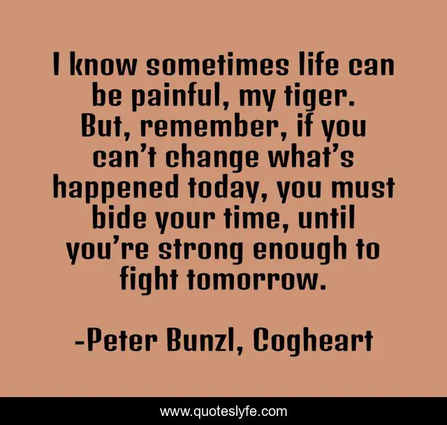 This page presents the quote "I know sometimes life can be painful, my tiger. But, remember, if you can’t change what’s happened today, you must bide your time, until you’re strong enough to fight tomorrow.". Author of this quote is Peter Bunzl, Cogheart. This quote is about fight, mrs-rust, strength, strategy,.