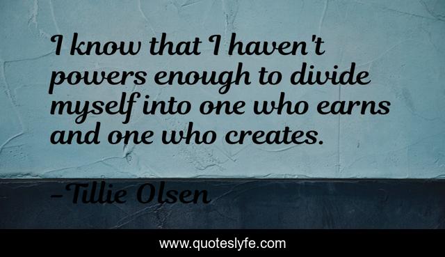 This page presents the quote "I know that I haven't powers enough to divide myself into one who earns and one who creates.". Author of this quote is Tillie Olsen. .