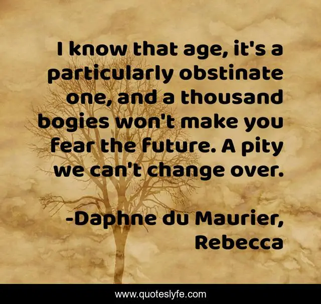 This page presents the quote "I know that age, it's a particularly obstinate one, and a thousand bogies won't make you fear the future. A pity we can't change over.". Author of this quote is Daphne du Maurier, Rebecca. This quote is about youth, naivete, age, innocence,.