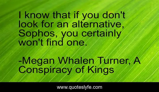 This page presents the quote "I know that if you don't look for an alternative, Sophos, you certainly won't find one.". Author of this quote is Megan Whalen Turner, A Conspiracy of Kings. This quote is about good-advice, eugenides, logic,.