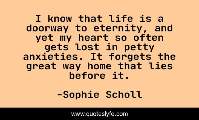This page presents the quote "I know that life is a doorway to eternity, and yet my heart so often gets lost in petty anxieties. It forgets the great way home that lies before it.". Author of this quote is Sophie Scholl. This quote is about courage, christianity,.
