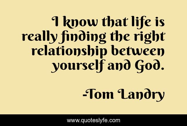 This page presents the quote "I know that life is really finding the right relationship between yourself and God.". Author of this quote is Tom Landry. This quote is about god, life, yourself,.