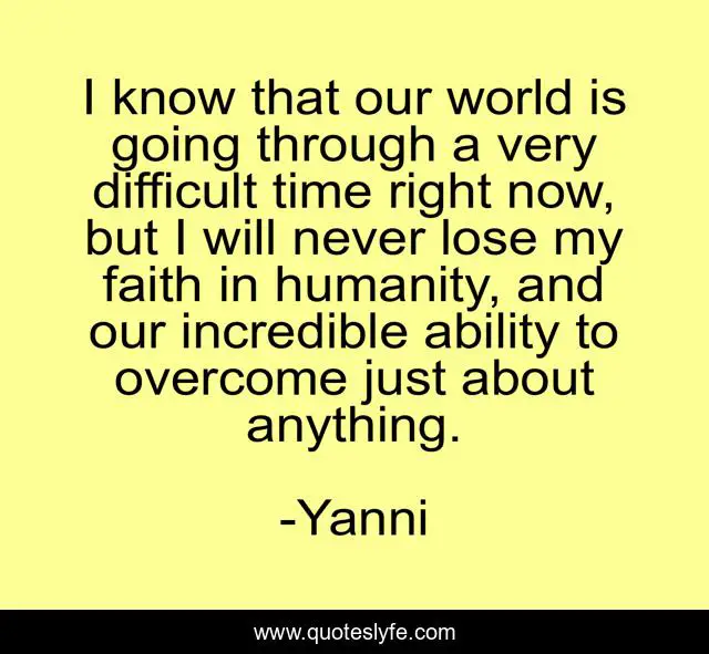 This page presents the quote "I know that our world is going through a very difficult time right now, but I will never lose my faith in humanity, and our incredible ability to overcome just about anything.". Author of this quote is Yanni. This quote is about challenges, humanity, power,.