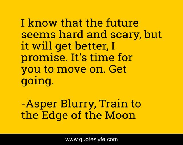 This page presents the quote "I know that the future seems hard and scary, but it will get better, I promise. It's time for you to move on. Get going.". Author of this quote is Asper Blurry, Train to the Edge of the Moon. This quote is about confidence, life-lessons, positive, motivational, reality, coming-of-age, optimistic, inspirational, strength-and-courage,.