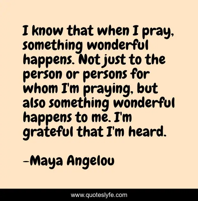 This page presents the quote "I know that when I pray, something wonderful happens. Not just to the person or persons for whom I'm praying, but also something wonderful happens to me. I'm grateful that I'm heard.". Author of this quote is Maya Angelou. This quote is about me, grateful,.