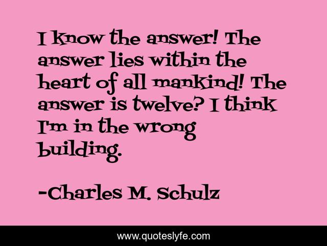 This page presents the quote "I know the answer! The answer lies within the heart of all mankind! The answer is twelve? I think I'm in the wrong building.". Author of this quote is Charles M. Schulz. This quote is about education, humor,.