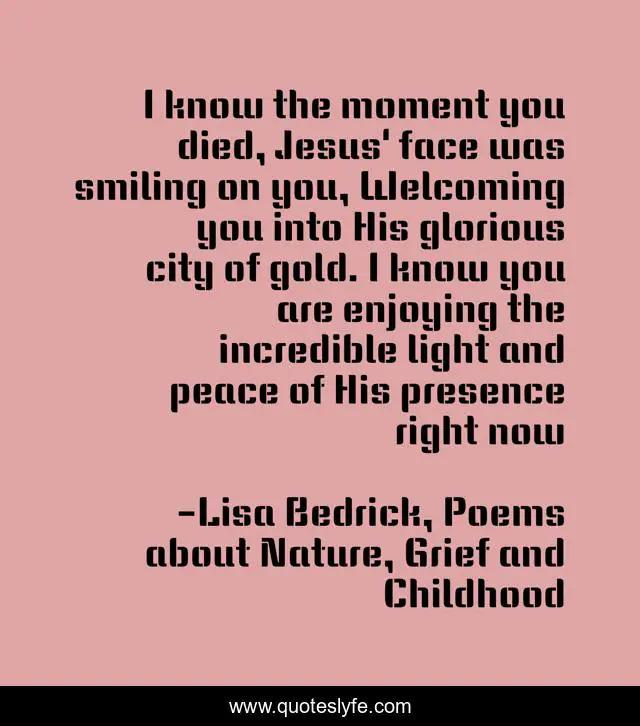 This page presents the quote "I know the moment you died, Jesus' face was smiling on you, Welcoming you into His glorious city of gold. I know you are enjoying the incredible light and peace of His presence right now". Author of this quote is Lisa Bedrick, Poems about Nature, Grief and Childhood. This quote is about streets-of-gold, death, love, god, peace, after-life, grief, heaven, joy,.