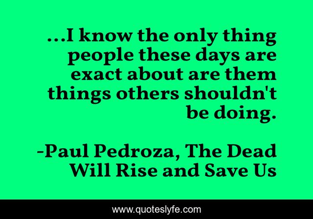This page presents the quote "...I know the only thing people these days are exact about are them things others shouldn't be doing.". Author of this quote is Paul Pedroza, The Dead Will Rise and Save Us. This quote is about people, wisdom,.