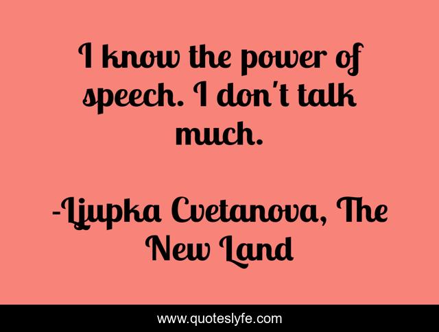 This page presents the quote "I know the power of speech. I don't talk much.". Author of this quote is Ljupka Cvetanova, The New Land. This quote is about don-t-talk-too-muchalk, aphorism, sarcastic-humor, power, quote, irony, misunderstanding, power-of-speec, cautious,.