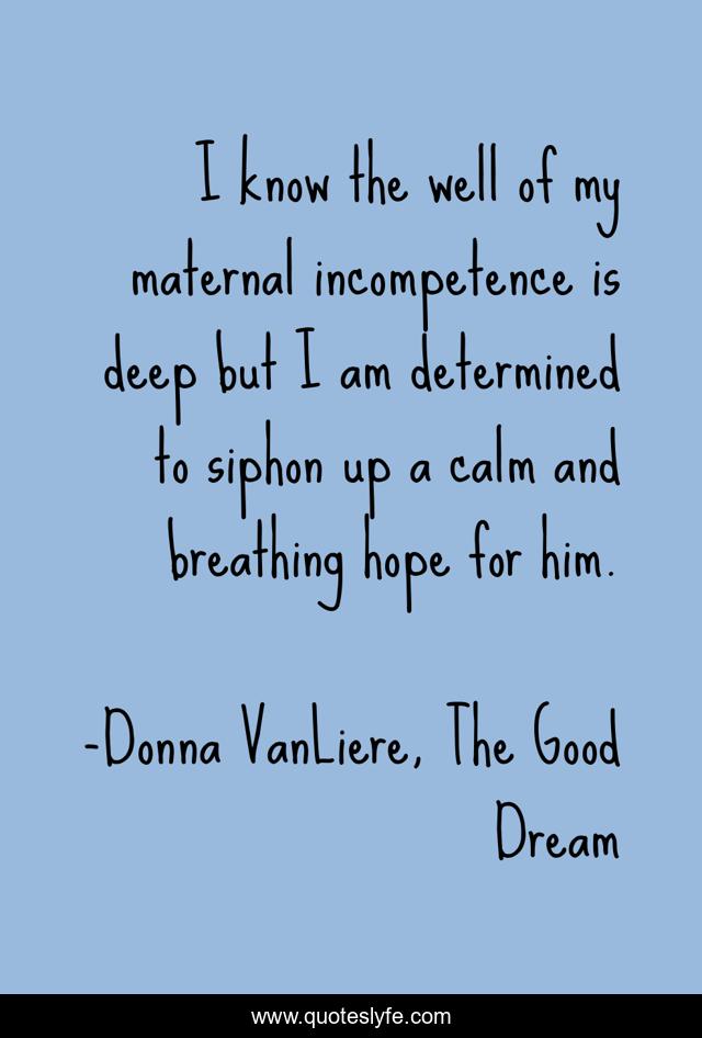 This page presents the quote "I know the well of my maternal incompetence is deep but I am determined to siphon up a calm and breathing hope for him.". Author of this quote is Donna VanLiere, The Good Dream. This quote is about motherhood, inspirational, enthusiasm,.