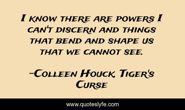 This page presents the quote "I know there are powers I can't discern and things that bend and shape us that we cannot see.". Author of this quote is Colleen Houck, Tiger's Curse. This quote is about mr-kadam, spiritual, supernatural, power,.