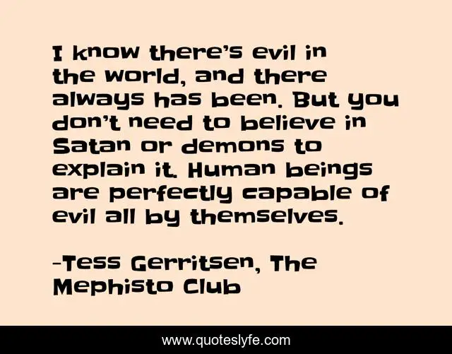 This page presents the quote "I know there’s evil in the world, and there always has been. But you don’t need to believe in Satan or demons to explain it. Human beings are perfectly capable of evil all by themselves.". Author of this quote is Tess Gerritsen, The Mephisto Club. This quote is about humanity, evil,.