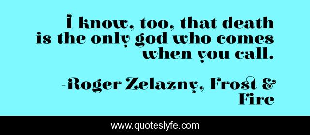 This page presents the quote "I know, too, that death is the only god who comes when you call.". Author of this quote is Roger Zelazny, Frost & Fire. This quote is about gods, suicide, death, mythology,.