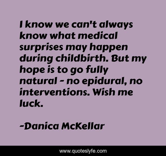 This page presents the quote "I know we can't always know what medical surprises may happen during childbirth. But my hope is to go fully natural - no epidural, no interventions. Wish me luck.". Author of this quote is Danica McKellar. This quote is about me, hope, luck,.