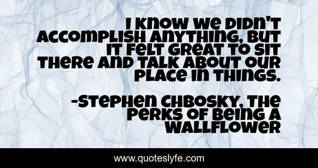 This page presents the quote "I know we didn't accomplish anything, but it felt great to sit there and talk about our place in things.". Author of this quote is Stephen Chbosky, The Perks of Being a Wallflower. This quote is about life, life-roles, existentialism, discussions, existence, friends,.