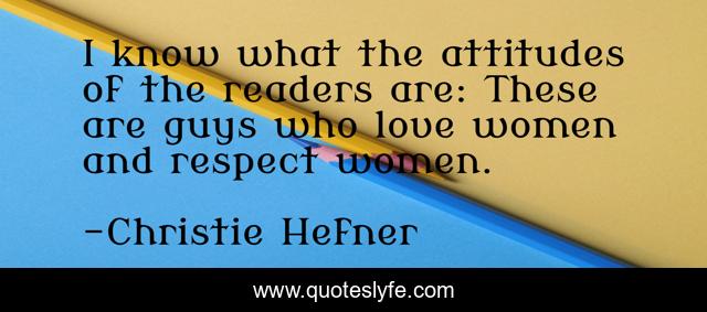 This page presents the quote "I know what the attitudes of the readers are: These are guys who love women and respect women.". Author of this quote is Christie Hefner. This quote is about love, affection, women,.