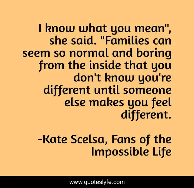 This page presents the quote "I know what you mean", she said. "Families can seem so normal and boring from the inside that you don't know you're different until someone else makes you feel different.". Author of this quote is Kate Scelsa, Fans of the Impossible Life. This quote is about fansoftheimpossiblelife, realisticfiction, ya, family,.