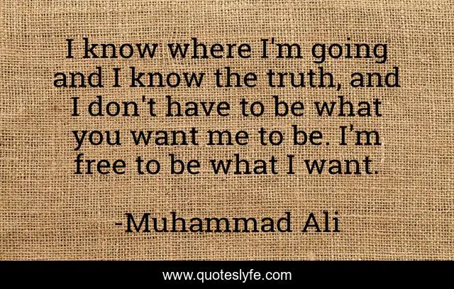 This page presents the quote "I know where I'm going and I know the truth, and I don't have to be what you want me to be. I'm free to be what I want.". Author of this quote is Muhammad Ali. This quote is about me, confidence, positive, motivational, free, optimistic,.