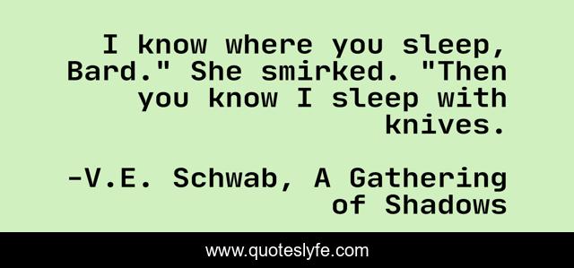 This page presents the quote "I know where you sleep, Bard." She smirked. "Then you know I sleep with knives.". Author of this quote is V.E. Schwab, A Gathering of Shadows. .