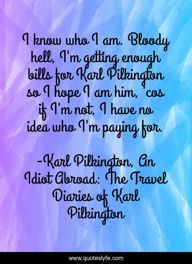 "Karl Pilkington, An Idiot Abroad: The Travel Diaries of Karl Pilkington Quotes." Quoteslyfe.com, 2025. Sat. 06 Dec. 2025. <https://www.quoteslyfe.com/quote/I-know-who-I-am-Bloody-hell-40584>.