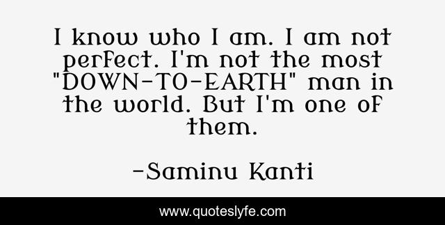 This page presents the quote "I know who I am. I am not perfect. I'm not the most "DOWN-TO-EARTH" man in the world. But I'm one of them.". Author of this quote is Saminu Kanti. This quote is about perfect, world, down-to-earth,.