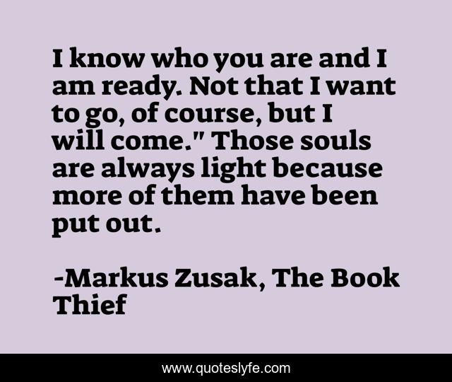 This page presents the quote "I know who you are and I am ready. Not that I want to go, of course, but I will come." Those souls are always light because more of them have been put out.". Author of this quote is Markus Zusak, The Book Thief. .