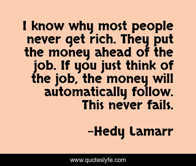 This page presents the quote "I know why most people never get rich. They put the money ahead of the job. If you just think of the job, the money will automatically follow. This never fails.". Author of this quote is Hedy Lamarr. This quote is about job, rich, people,.